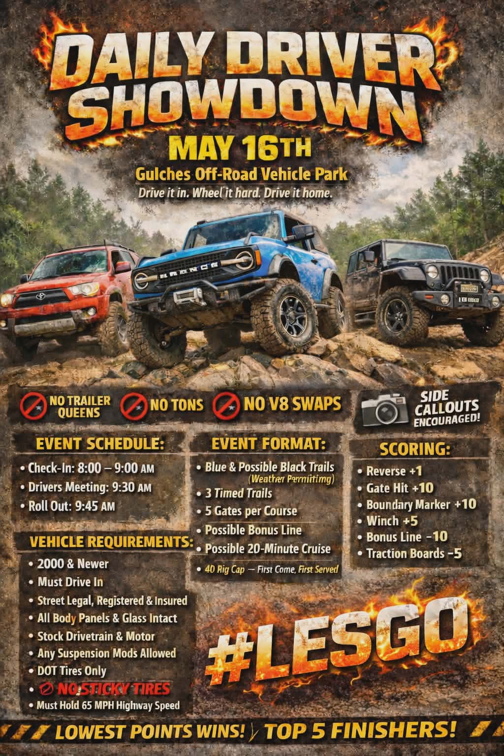 Showdown of the DAILY DRIVEN JEEPS, TOYOTAS, AND BRONCOS at Gulches Offraod Vehicle Park in South Carolina.